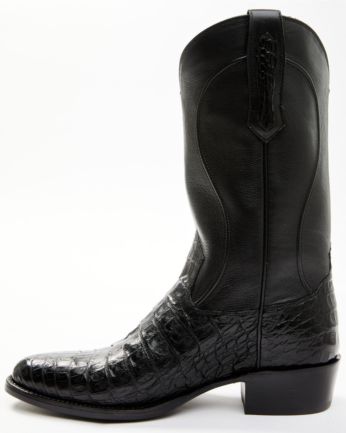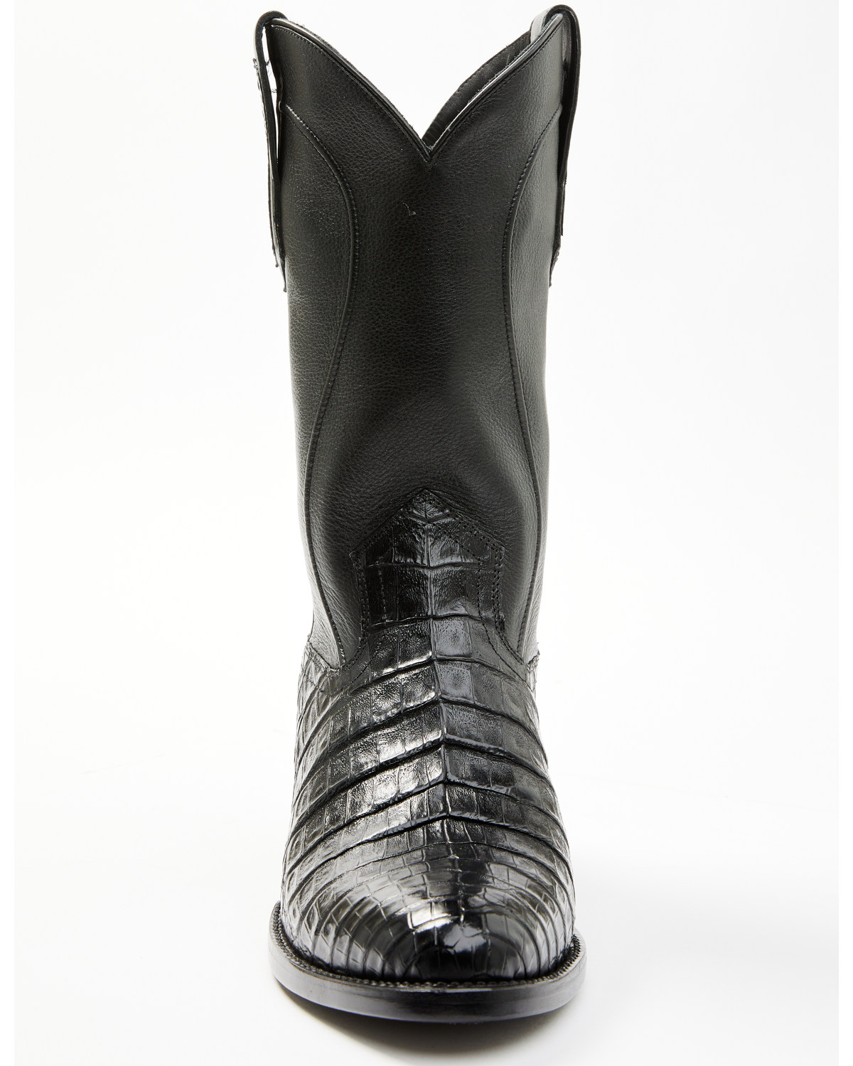 - Durable genuine caiman belly vamp with genuine calfskin shaft