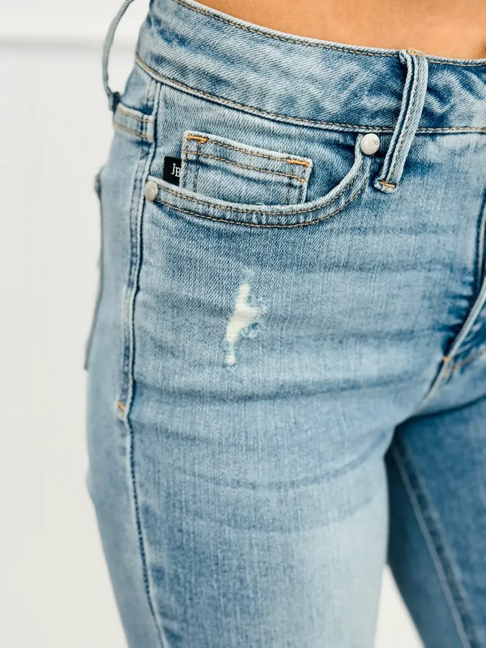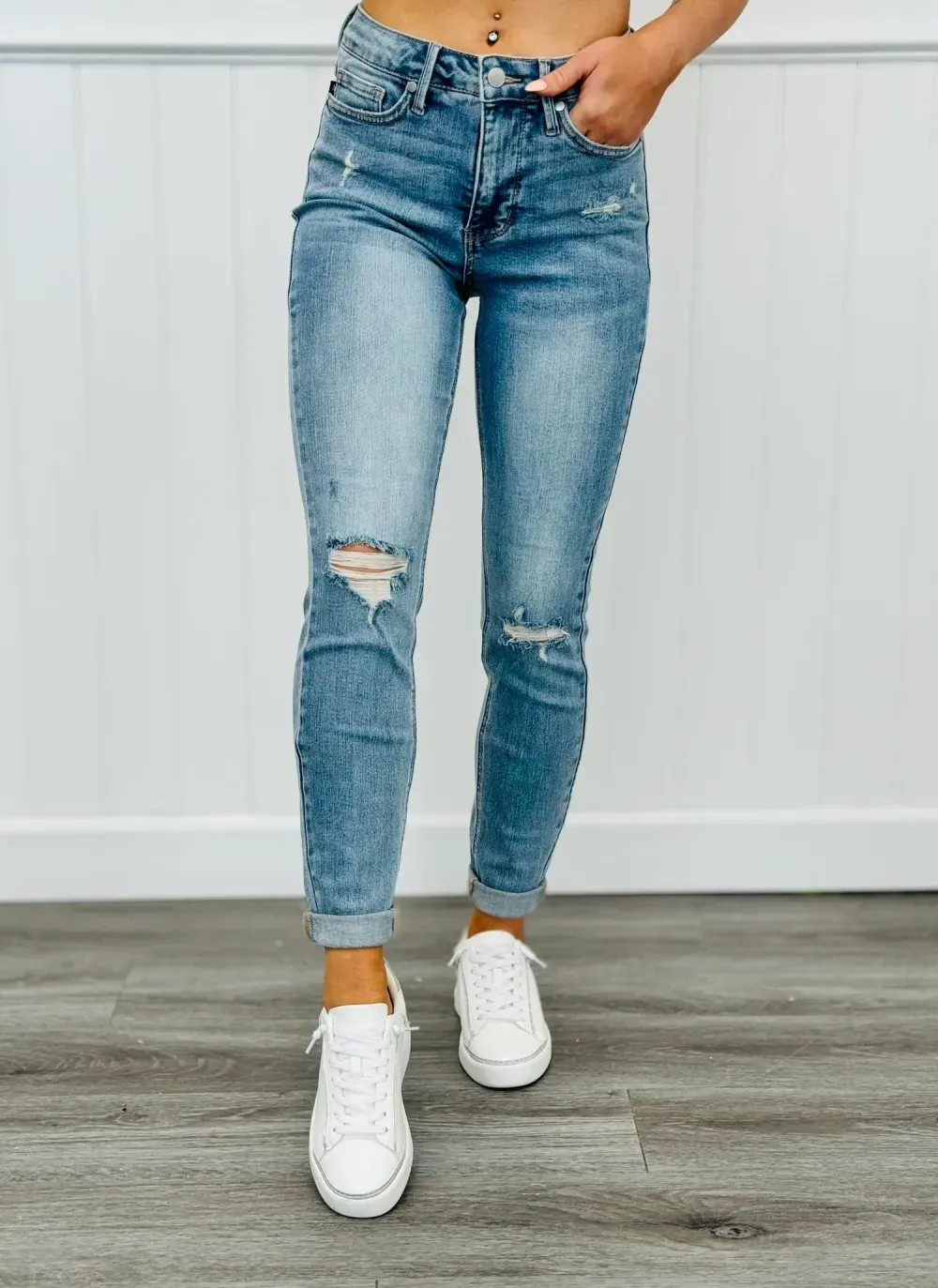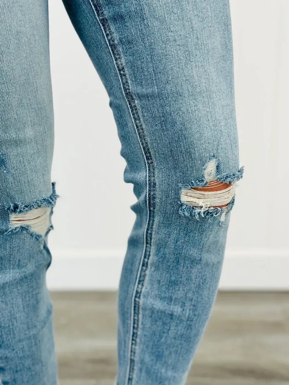 Get ready to slay all day with the All In Mid-Rise Skinny Jeans. With tummy control to give you a smooth silhouette and a mid rise for a flattering fit, these jeans will make you feel confident and comfortable. The distressed design adds a touch of edginess to any outfit. Available in regular and plus sizes.