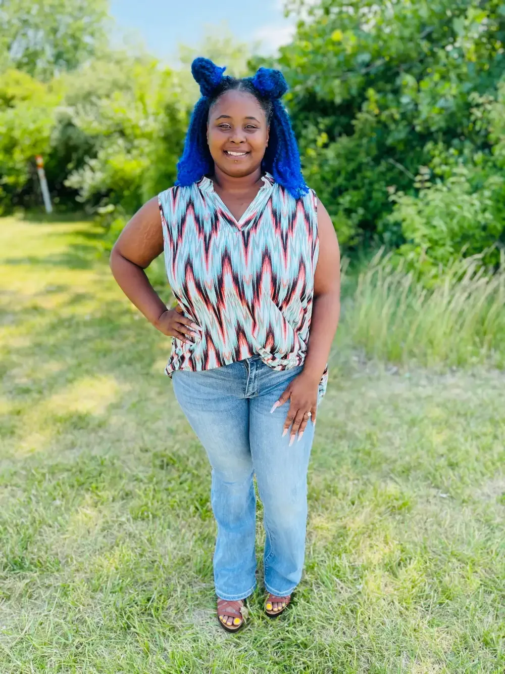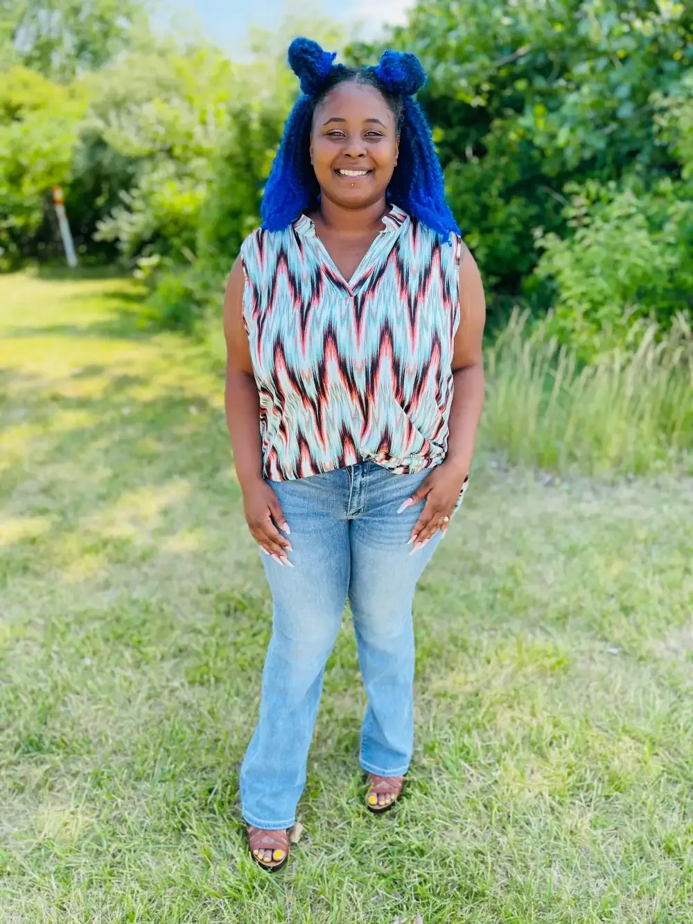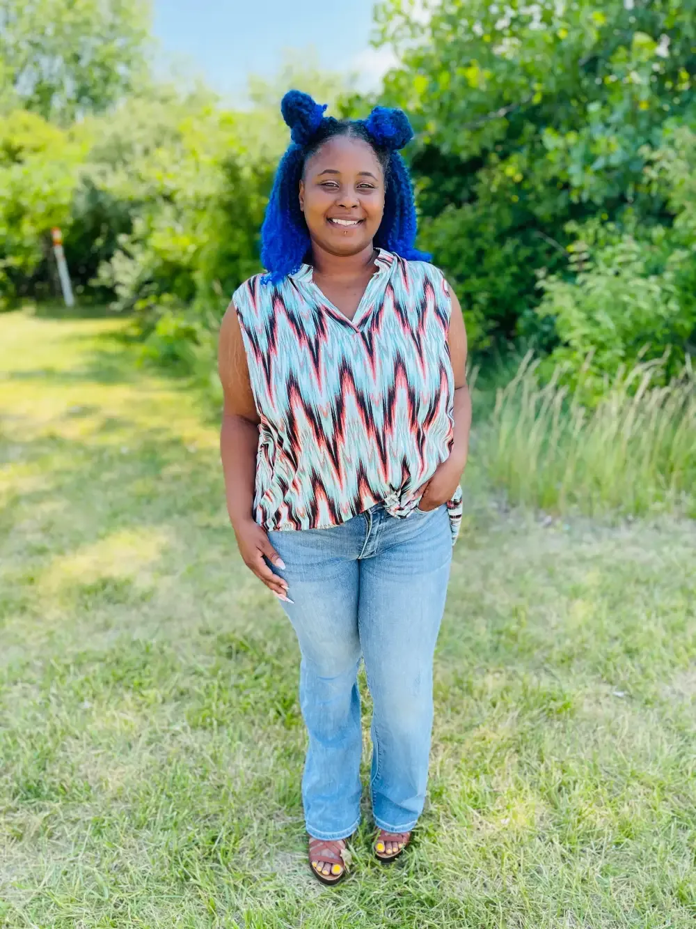Another one of our plus size models of our fit team wears a 16w in department stores and her true size is a 14w in MOCO denim and she preferred to stay true to size in a 14w.