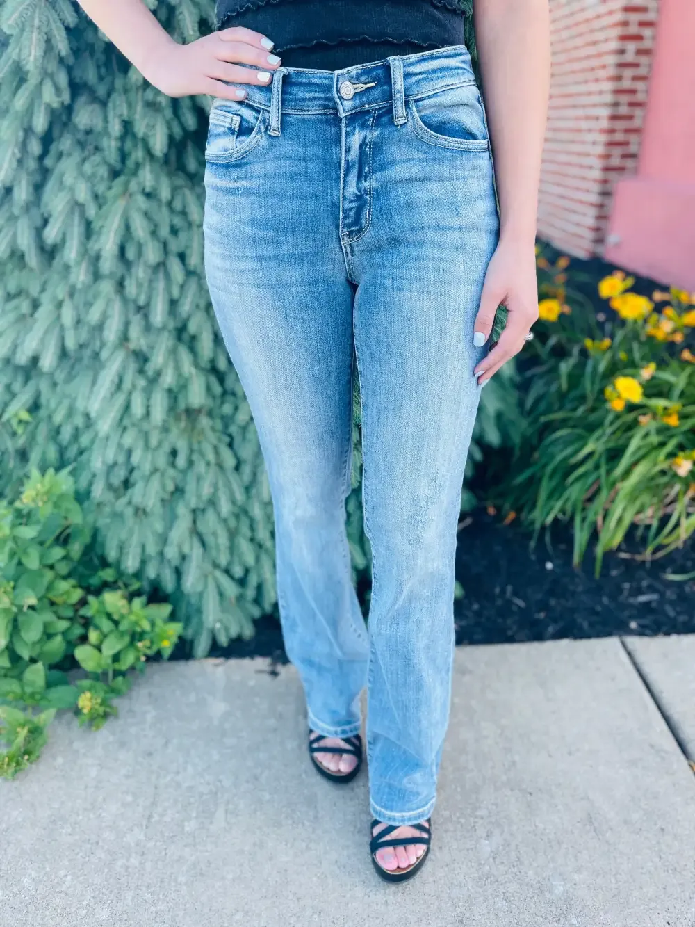 These jeans are incredibly soft... like seriously and the stretch is amazing, too! They snap right back and keep you feeling long and lean with that fun bootcut hemline! These jeans have a medium to lighter wash with epic whiskering to help you feel confident all day long!