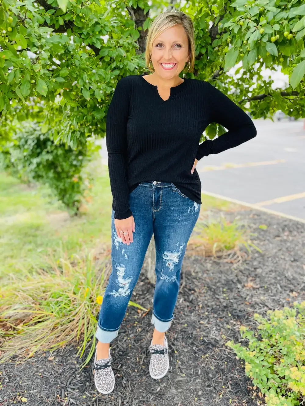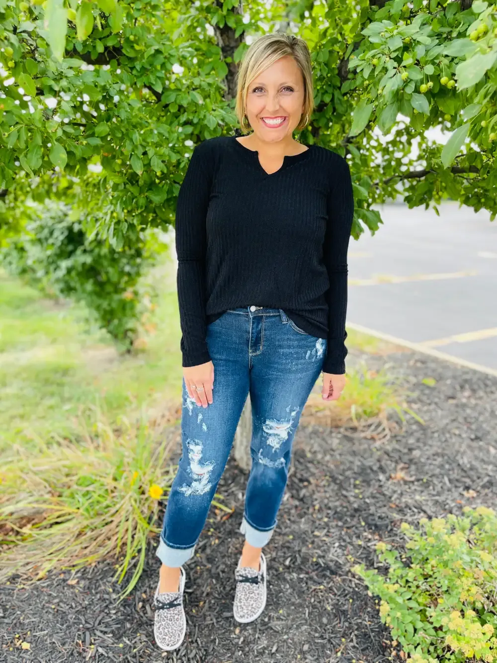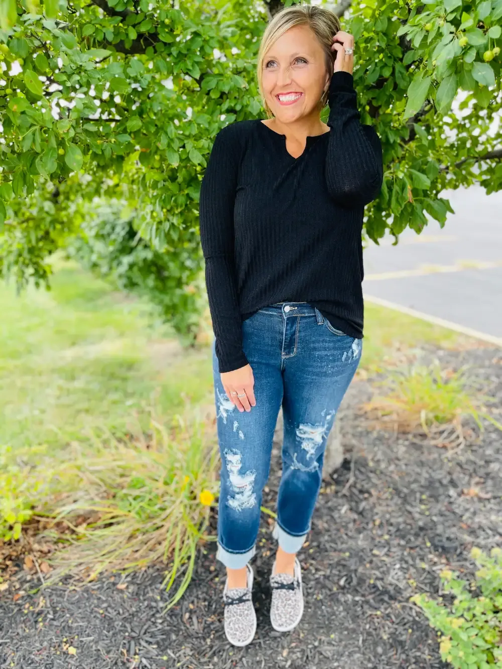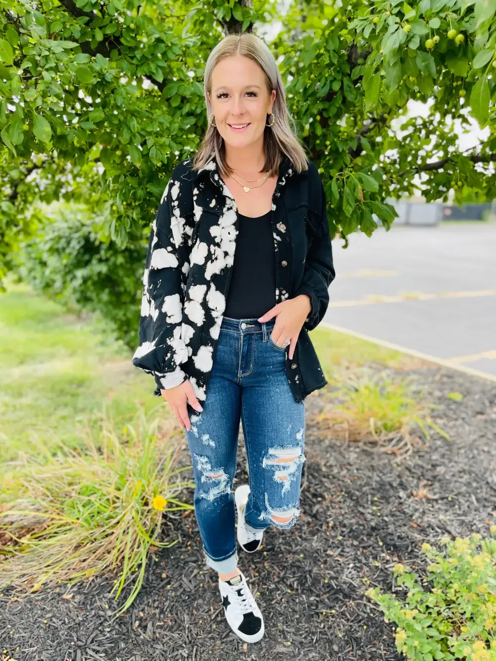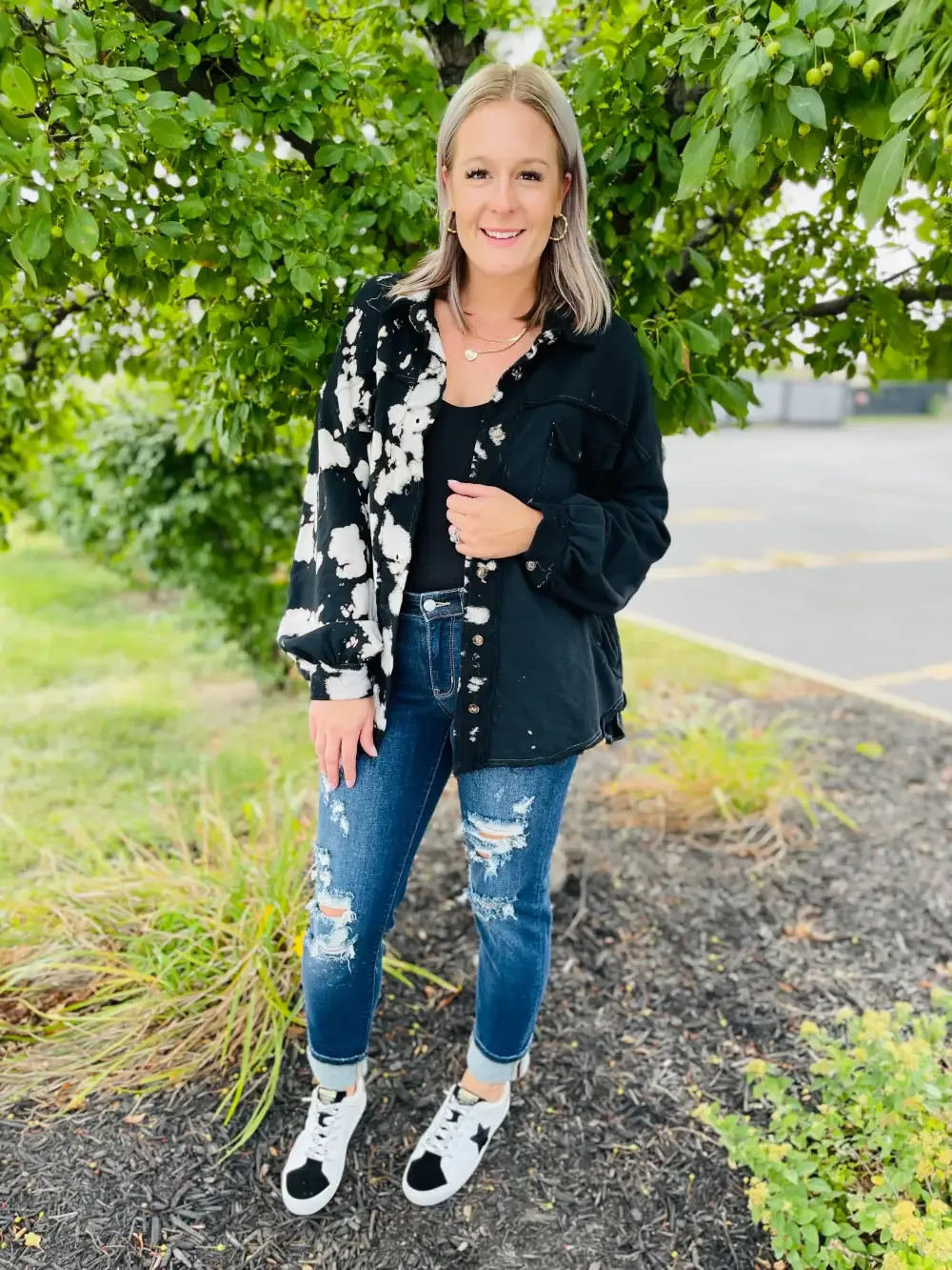 These brand new dark wash bleach splatter boyfriend jeans are a MUST have for so many reasons! The fabrication is absolutely perfection and the stretch and comfort is truly out of this world! (Download the free MOCO Boutique App to see a video demo of just how stretchy these jeans are)!
