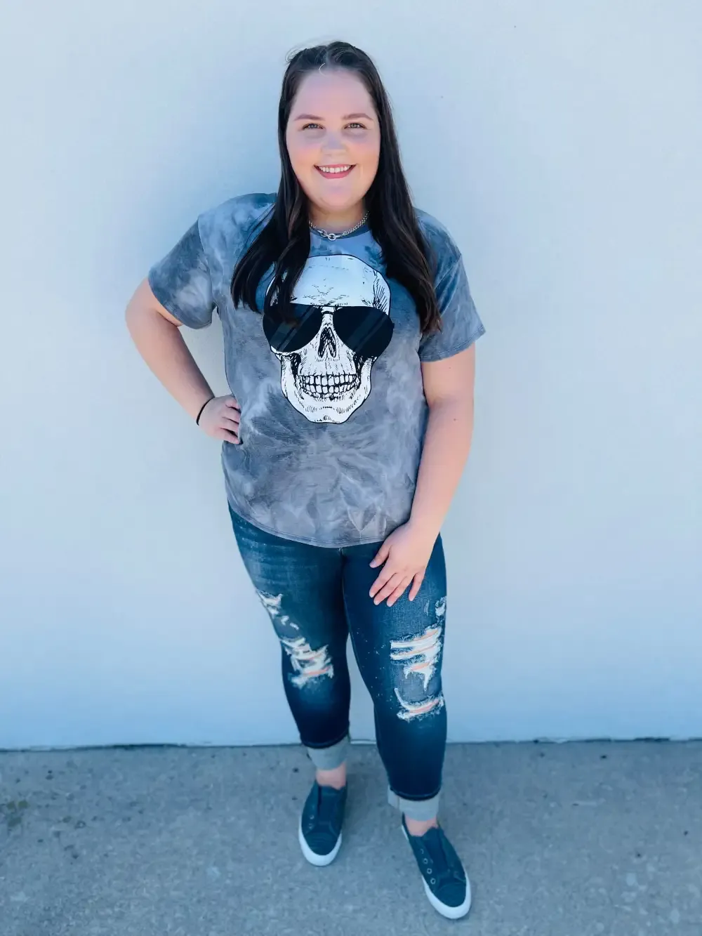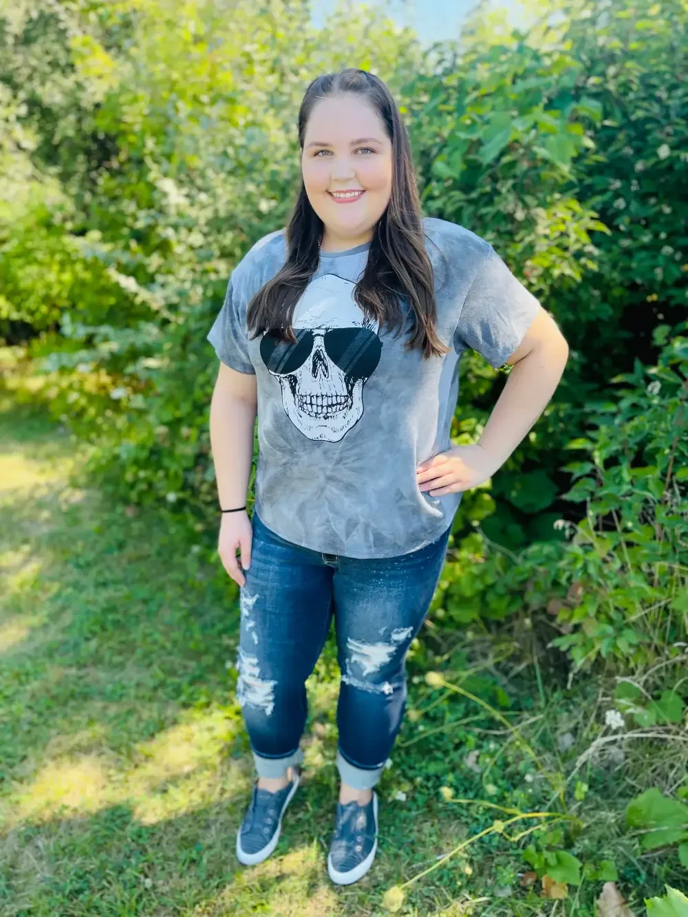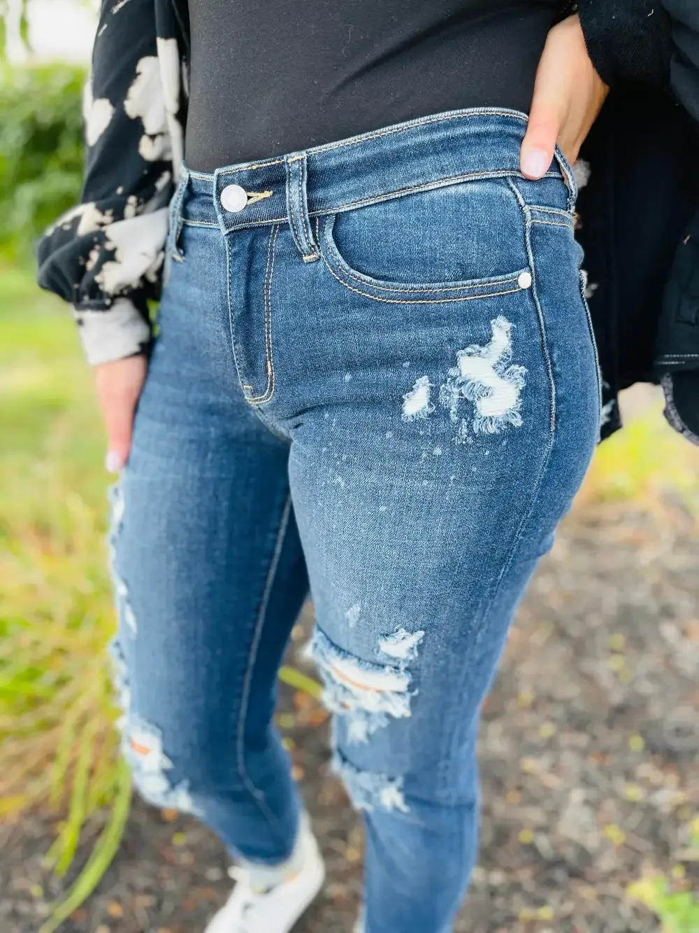 The dark wash on these is super slimming and the grain makes them even more slimming! Bleach splatter is always a best seller for us because of how trendy it is.