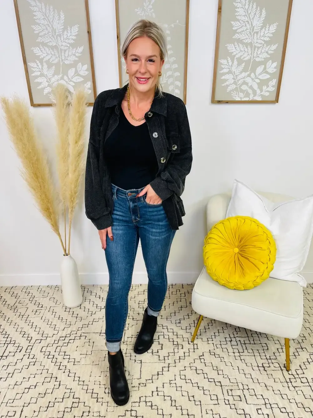 Lindsay is wearing these jeans with the Focus On Me Shacket.