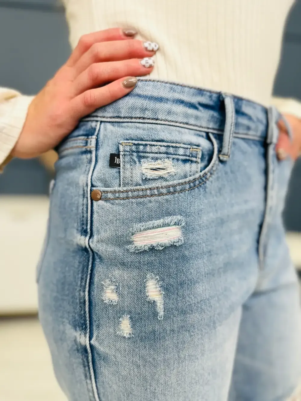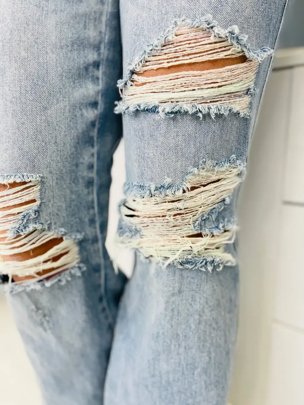 (3) Rainbow Thread-- the distressing features RAINBOW THREADING. Yes, you read that right! The distressing makes our hearts so happy and you are going to want to wear these every single day!