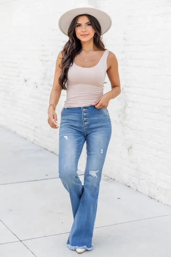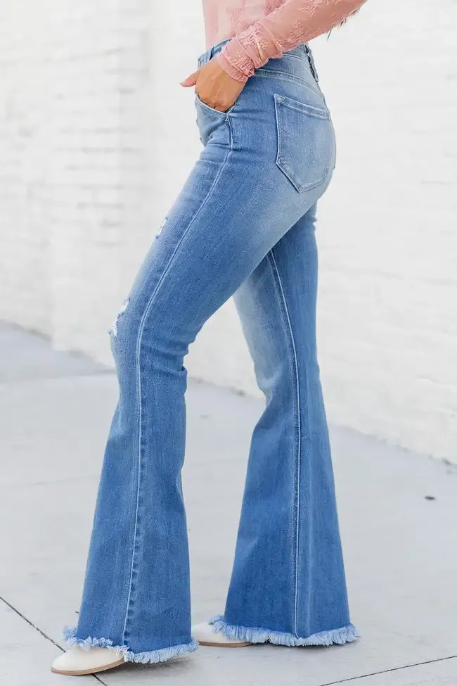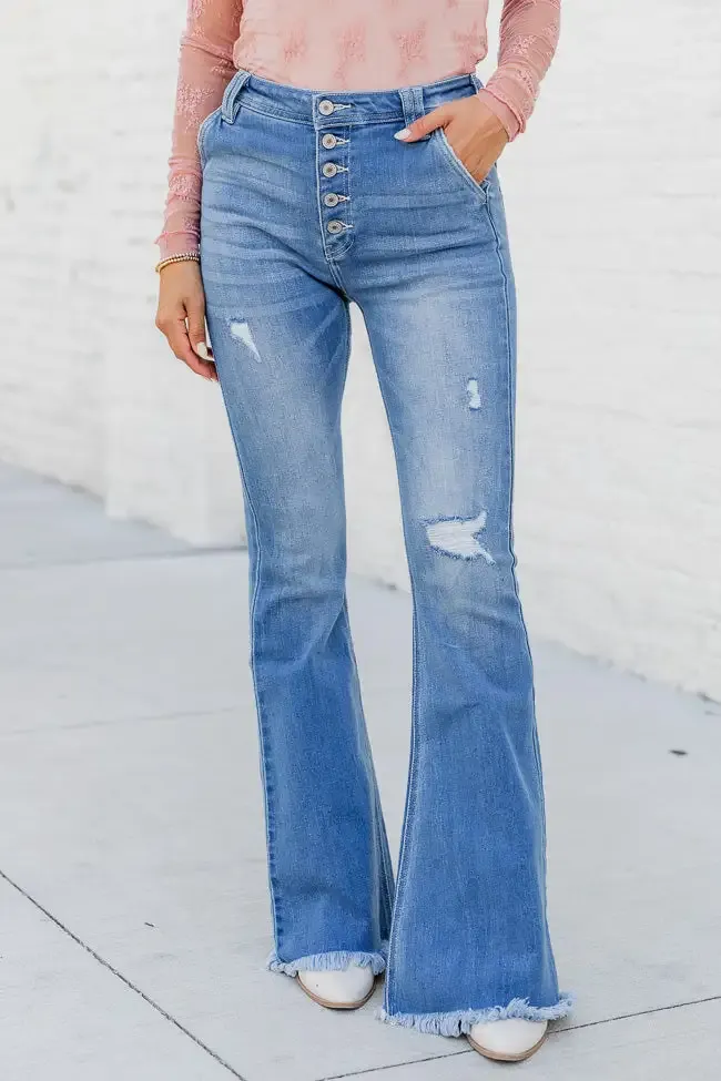 These stylish light blue flarelegjeans are such a must-have style for any season! We love the trendy distressing on the leg paired with a fun fringe hem. Plus we lovethebutton detail closure it's so adorable.Pair these stylish jeans with a bodysuit and a fedora hat for a day out!