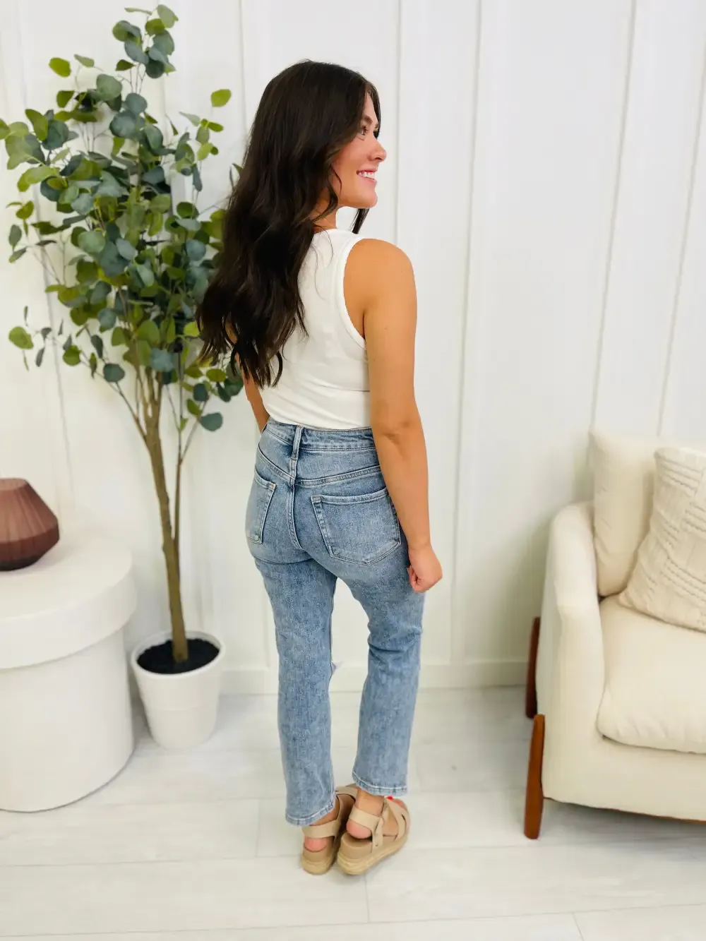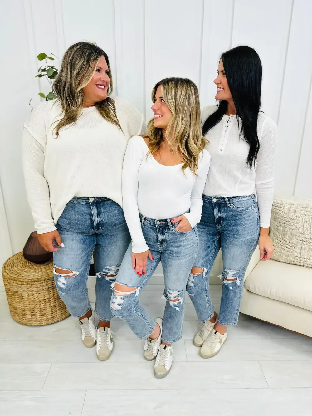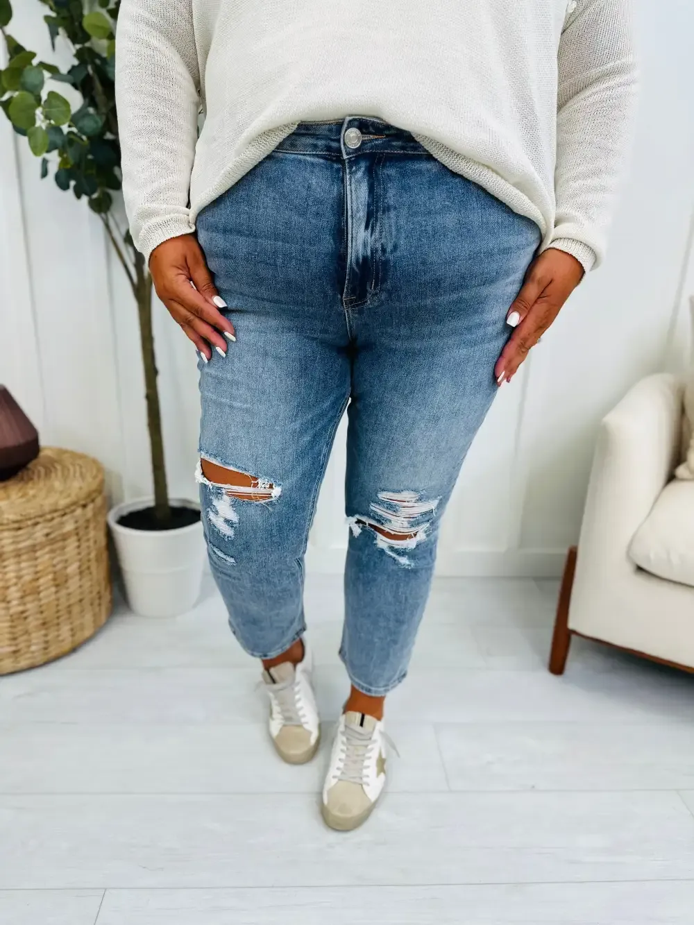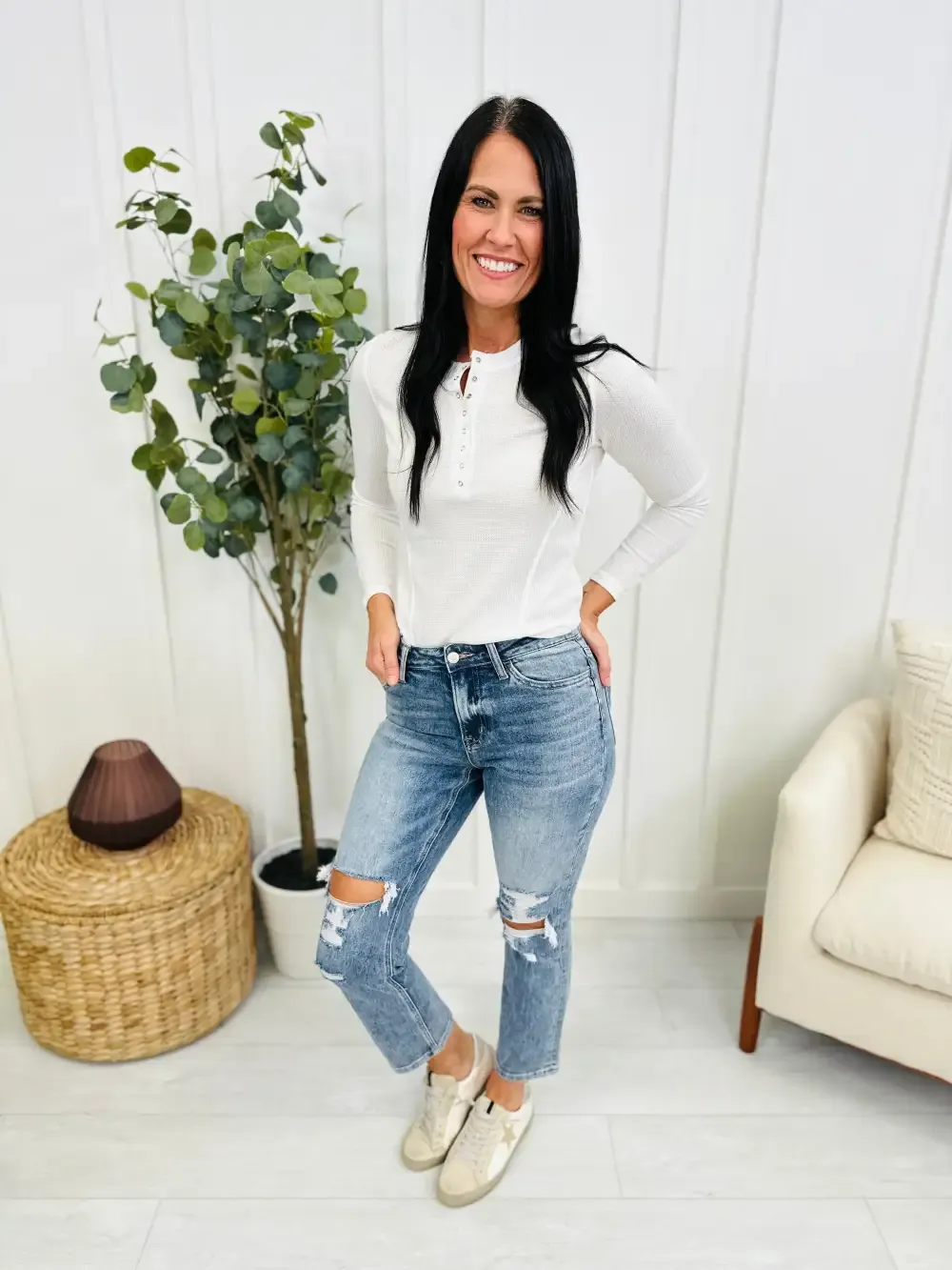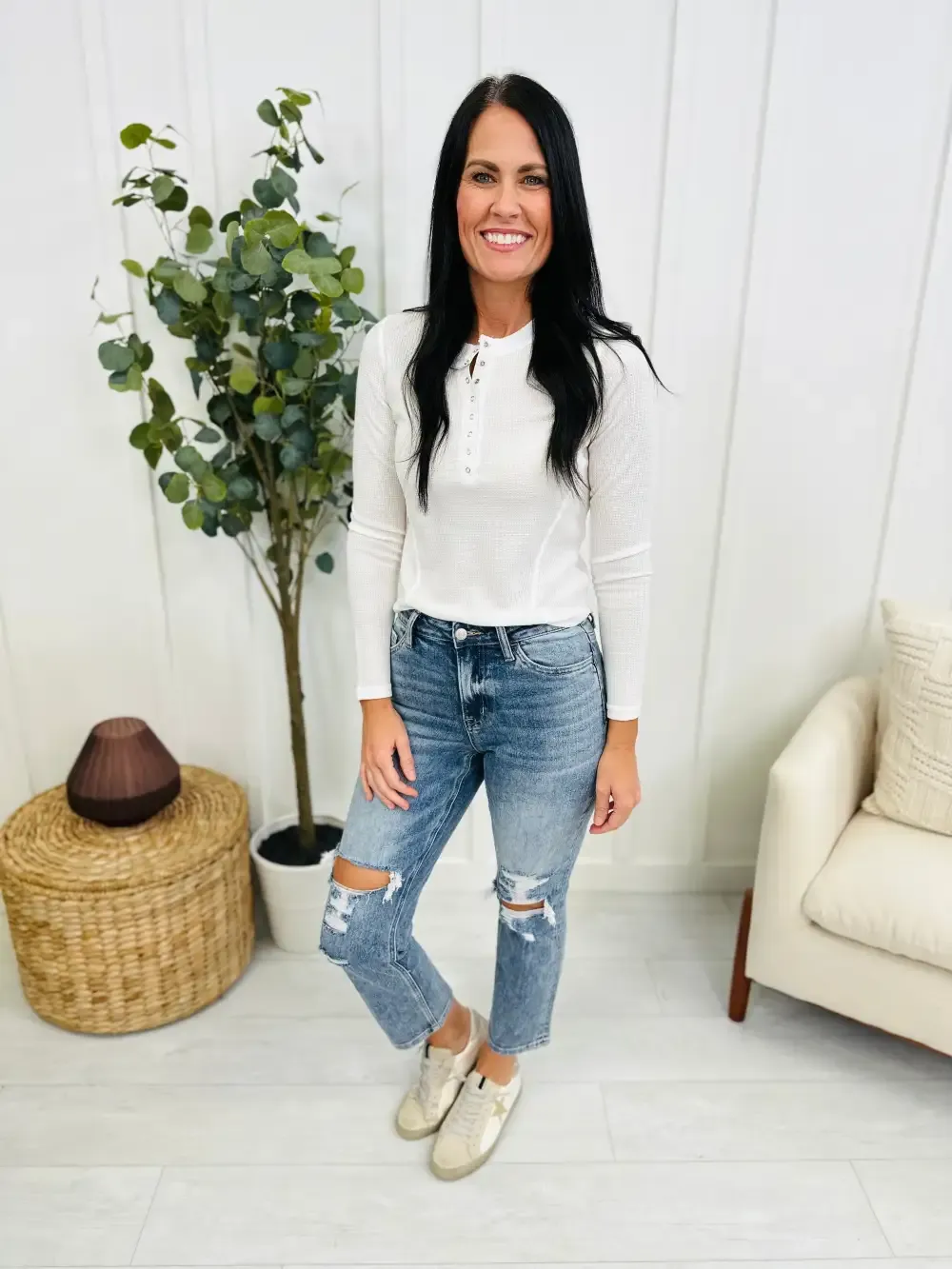 These cropped jeans are SO trendy! They feature a cropped inseam and distressing that we cannot get enough of!