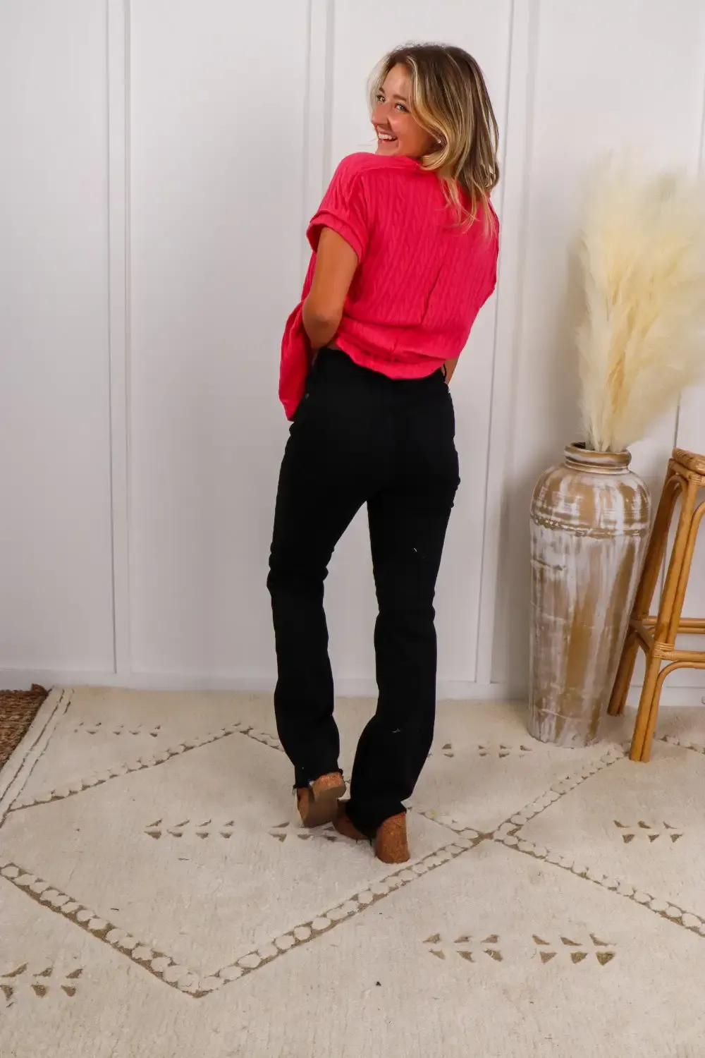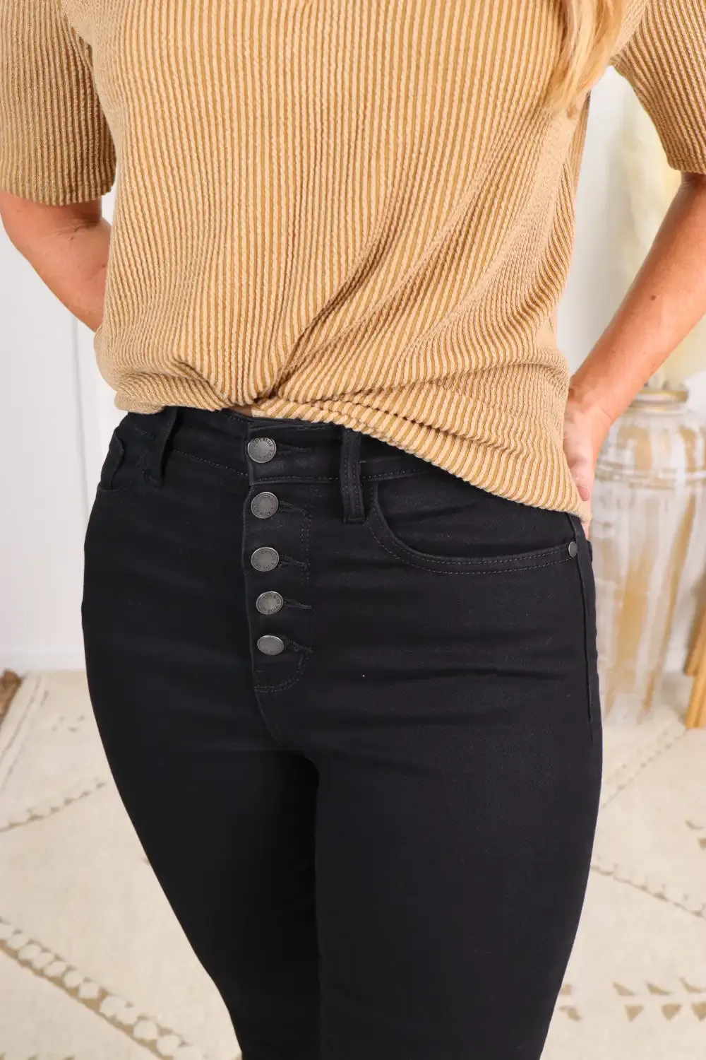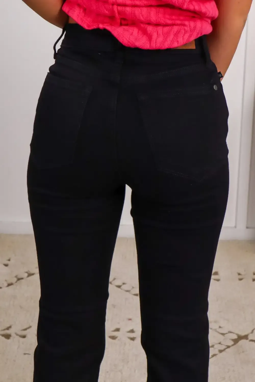Elevate your denim game with our Judy Blue Midnight Desperado jeans. These high-rise jeans feature a button fly for easy wear and boast a 4-way stretch fabric that provides unparalleled comfort and flexibility. The bootcut silhouette is designed to flatter your curves and elongate your figure, giving you a confident and sleek look. With their classic and timeless appearance, these jeans effortlessly complement any style and pair seamlessly with your favorite tops. You can trust these jeans to maintain their shape all day long—they don't sag or stretch out. The solid black non-distressed finish adds a touch of sophistication to your outfits, making these jeans a versatile staple in your wardrobe.