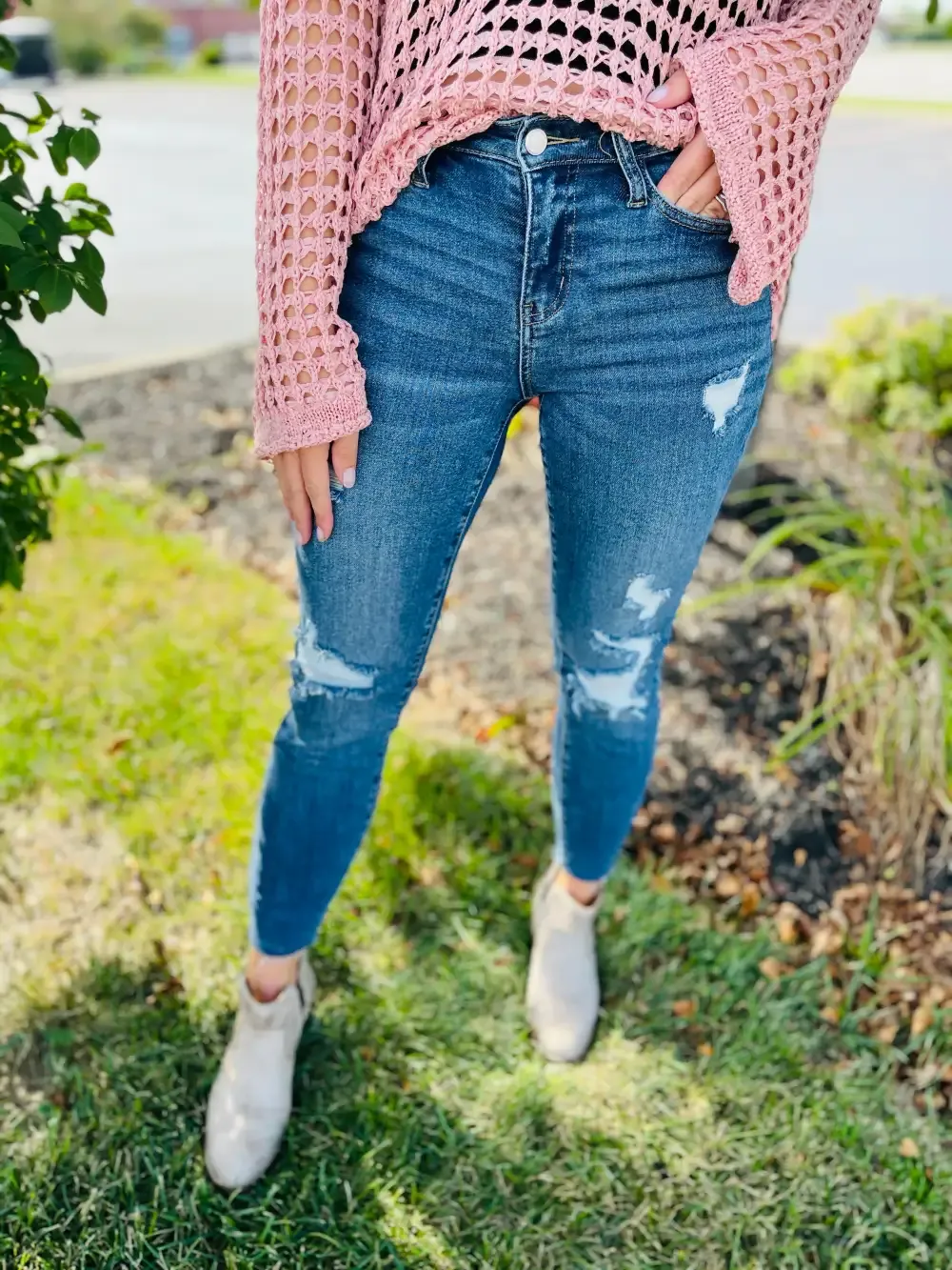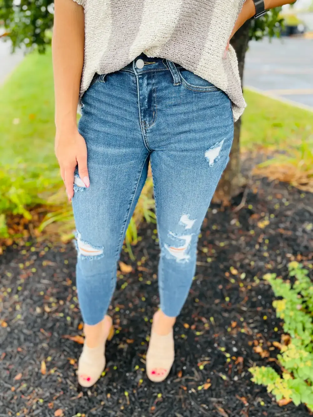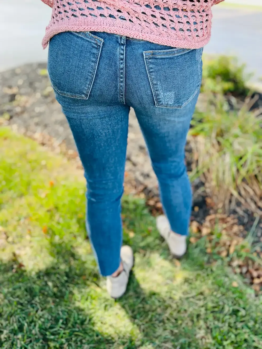 These jeans have awesome stretch in the waist, thighs, and all the way down to the ankle and provide ultimate comfort! The medium wash is super versatile and can be worn from season to season with ease. They can easily be dressed up with wedges and booties or down with sneakers! Check out the fit video on the free MOCO Boutique App for a demo of the stretch!